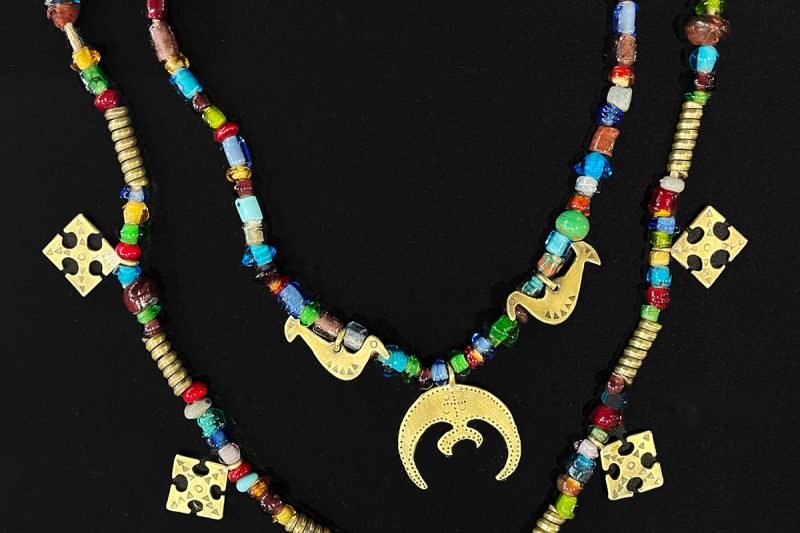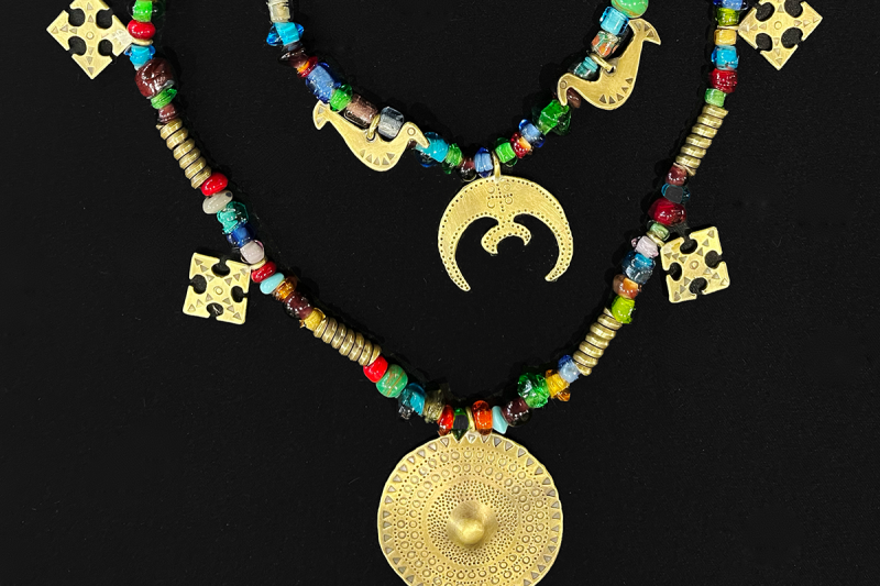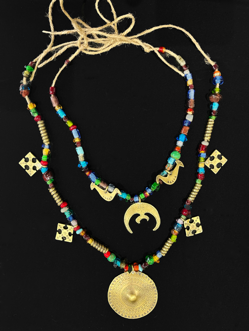 Interpretation of archeological Latgalian necklaces from the 12th century — the time when glass (in the form of beads) first appeared in the territory of present-day Latvia.Flameworked glass beads and brass elements made using primitive tools.2024